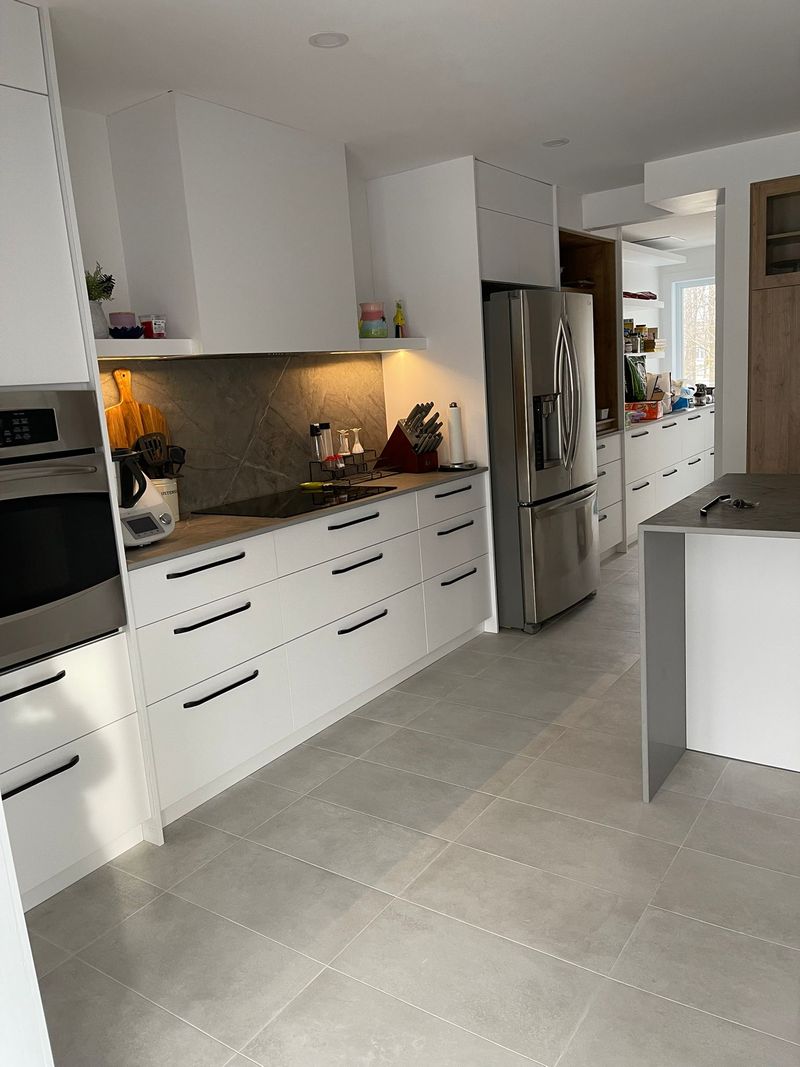 Rénovation de cuisine avec des armoires en polymère de haute qualité, alliant esthétisme et praticité pour un espace de vie accueillant et moderne.