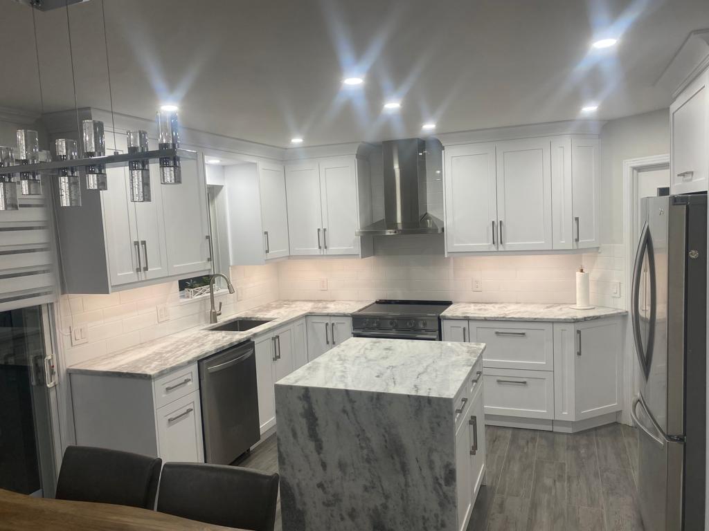 Transformation complète de la cuisine avec des armoires en polymère sur mesure, offrant un design élégant et une organisation optimale.