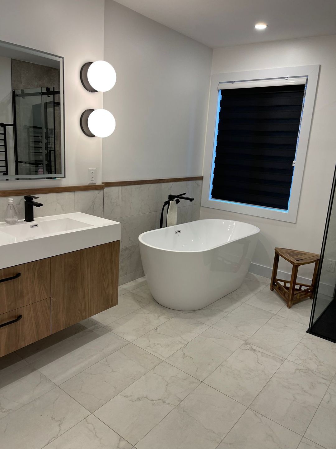 Rénovation complète d’une salle de bain avec des rangements intégrés, des matériaux haut de gamme et une ambiance apaisante, offrant un espace de détente unique.